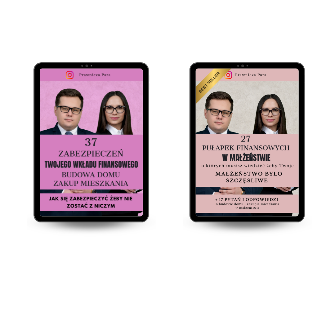2.Ebook 27 PUŁAPEK FINANSOWYCH W MAŁŻEŃSTWIE zawiera aż 27 zagadnień dotyczących istotnych, popularnych pułapek i błędów FINANSOWYCH oraz MAJĄTKOWYCH w MAŁŻEŃSTWIE, w którym panuje ustrój wspólności małżeńskiej (małżonkowie nie zawierali tzw. intercyzy) oraz 17 odpowiedzi na pytania naszych obserwujących, dotyczących BUDOWY DOMU oraz ZAKUPU MIESZKANIA przed i po ślubie, czyli łącznie 44 rozwiązania problemów i wątpliwości. Dowiesz się z niego do jakiego majątku jako MAŁŻONEK masz prawa, a co jest własnością tylko Twojego małżonka. Uzyskasz propozycje uregulowania Waszych spraw majątkowych. Unikniesz zaskoczenia podczas ewentualnego konfliktu w małżeństwie, tak aby nie zostać kiedyś z niczym. Albo po prostu dowiesz się, że wszystko jest u Was odpowiednio zabezpieczone i możesz spać spokojnie. Zyskasz świadomość, która pozwoli Ci uniknąć zdziwienia lub rozczarowania wtedy kiedy będzie już za późno, aby to prawnie uregulować.